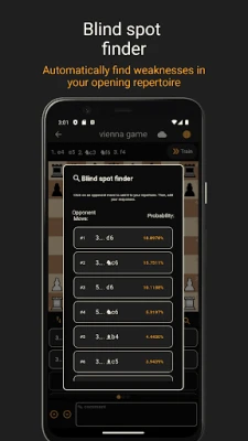 利用 Chess Prep Pro 强大的功能,您可以无限量地创建和定制个性化开局库。无论是经典布局还是冷门变招,都能细致入微地规划每一步,涵盖各种可能性,确保在任何开局中都胸有成竹。更有独创的"盲点侦测器",它将深入分析您的开局体系,基于数十亿真实玩家对局数据,精准识别您未曾充分准备的对手潜在着法,助您在策略上先行一步,化解潜在风险。